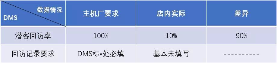 店内潜客回访在DMS系统中可统计的百分比仅为10%,且无回访记录,跟进后DMS系统均未维系,目前导致销售部、市场部、客服部、财务部、售后部在DMS系统上无法实现高效联动工作;