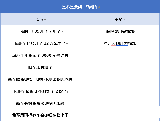 “好了,XX先生/女士,现在让我们把要买新车的原因写下来吧!”